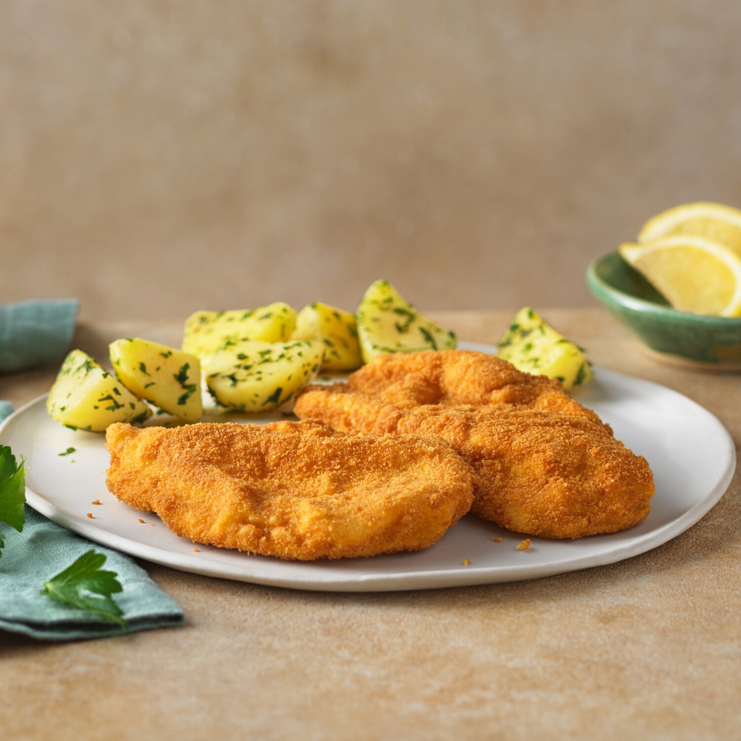 Un classique : l'escalope de poulet frite et croustillante avec de savoureuses pommes de terre au persil